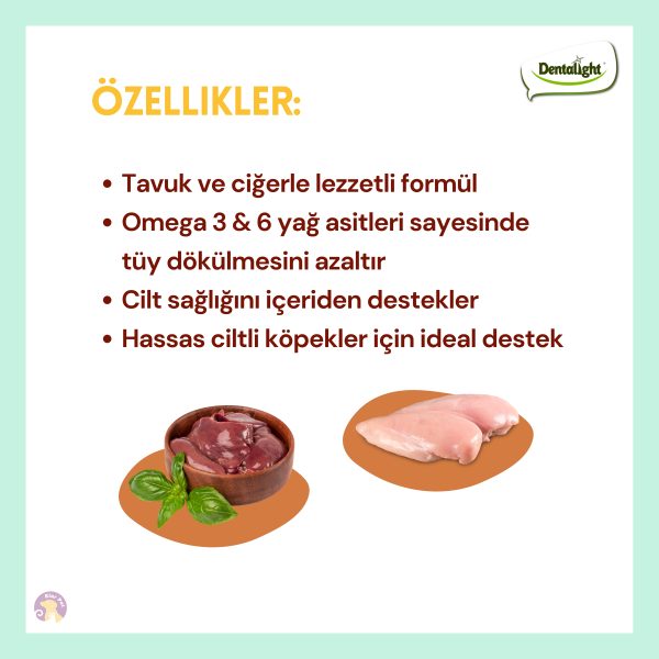 İçeriğindeki doğal kaynaklı Omega 3 ve 6 yağ asitleri (keten tohumu ve balık yağı), köpeğinizin sağlıklı deri ve parlak tüy yapısını destekler. Dentalight Yumm Köpek ödül maması , dostunuza hak ettiği sağlıklı ve lezzetli ikramdır.