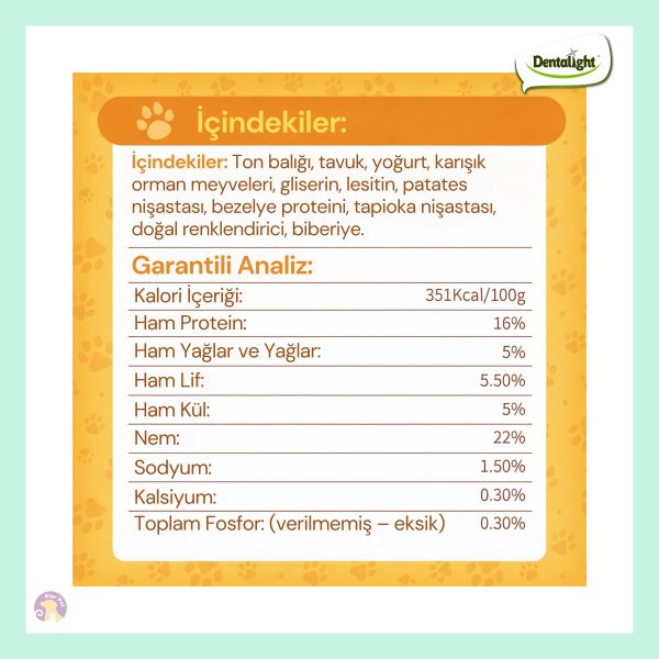 Dentalight Yumm Köpek Ödülü Orman Meyveli ve Ton Balıklı , gerçek ton balığı ile hazırlanan ve köpeğinizin sindirim sağlığını destekleyen doğal içeriklerle formüle edilmiş yumuşak bir ödül mamasıdır. İçeriğinde mısır, buğday, yapay aroma ve renklendirici bulunmaz.