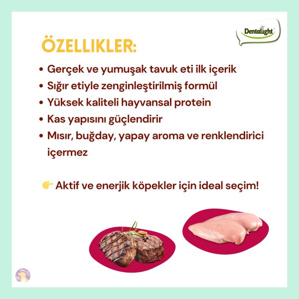 Dentalight yumm stix kopek odul mamasi, Yüksek kaliteli tavuk ve dana eti, kas gelişimini destekleyen doğal protein kaynaklarıdır. Yapay aroma, renklendirici, mısır ve buğday içermez. dentalight yumm stix kopek odul mamasi , Günde bir adet verilmesi önerilen bu ödül, 6 aydan büyük köpekler için idealdir.