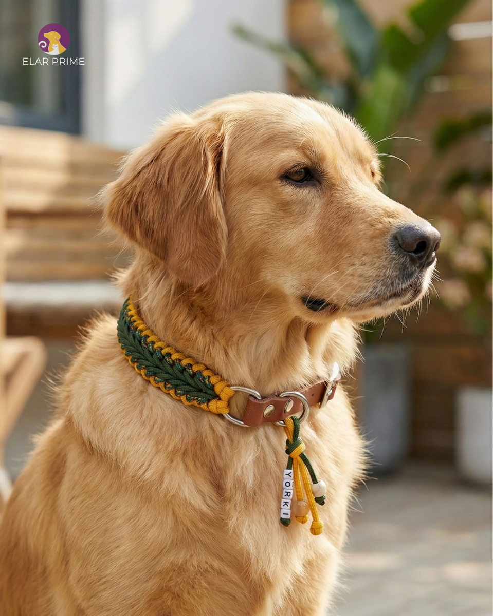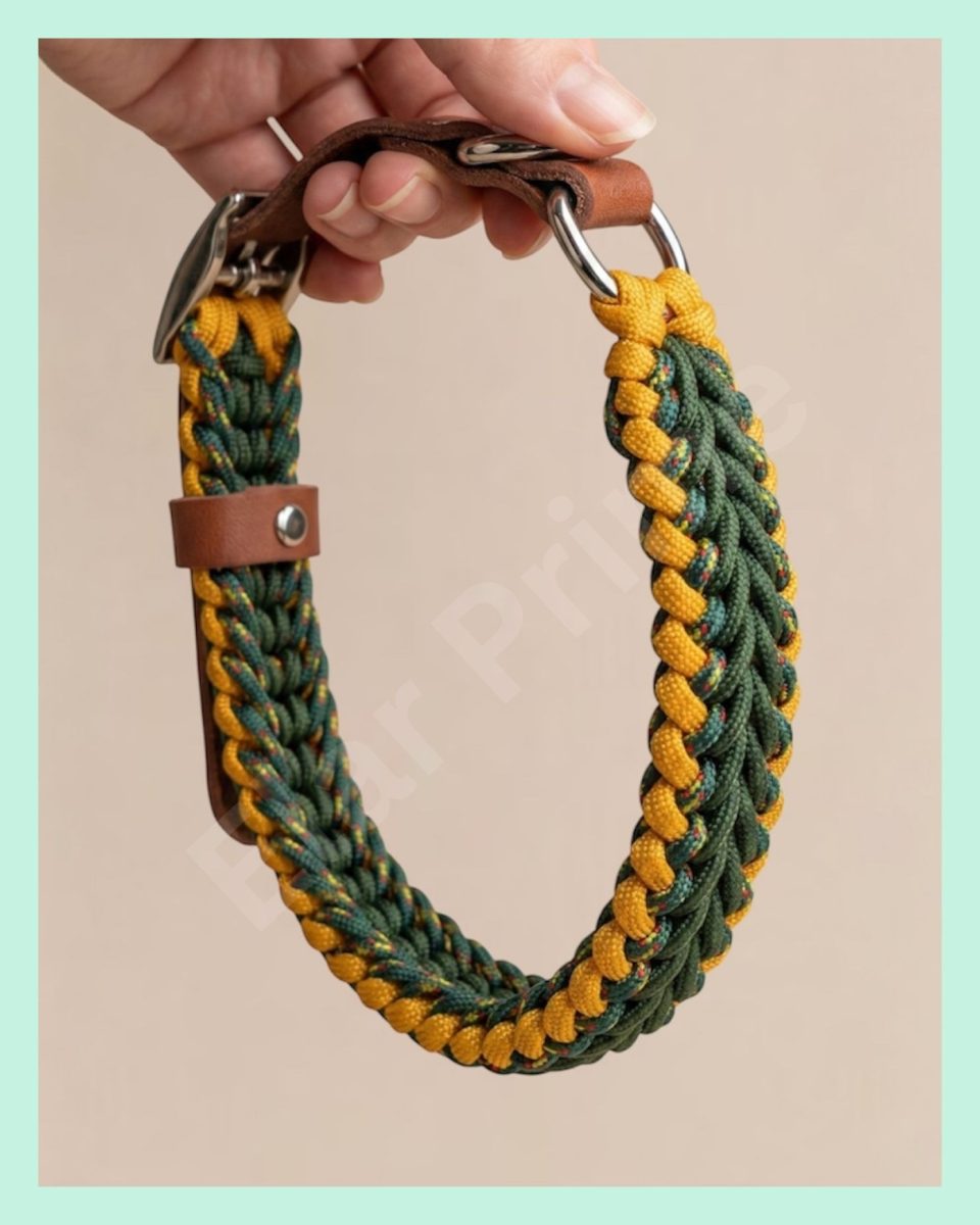 El Yapımı Paracord ve Deri Köpek Boyun Tasması – Örgü Slim 02 | Yeşil & Sarı