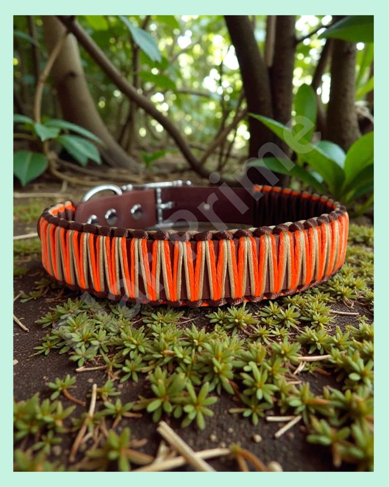 El Yapımı Deri ve Paracord Köpek Boyun Tasması – Örgü Urban 01 | Kahverengi, Turuncu & Bej