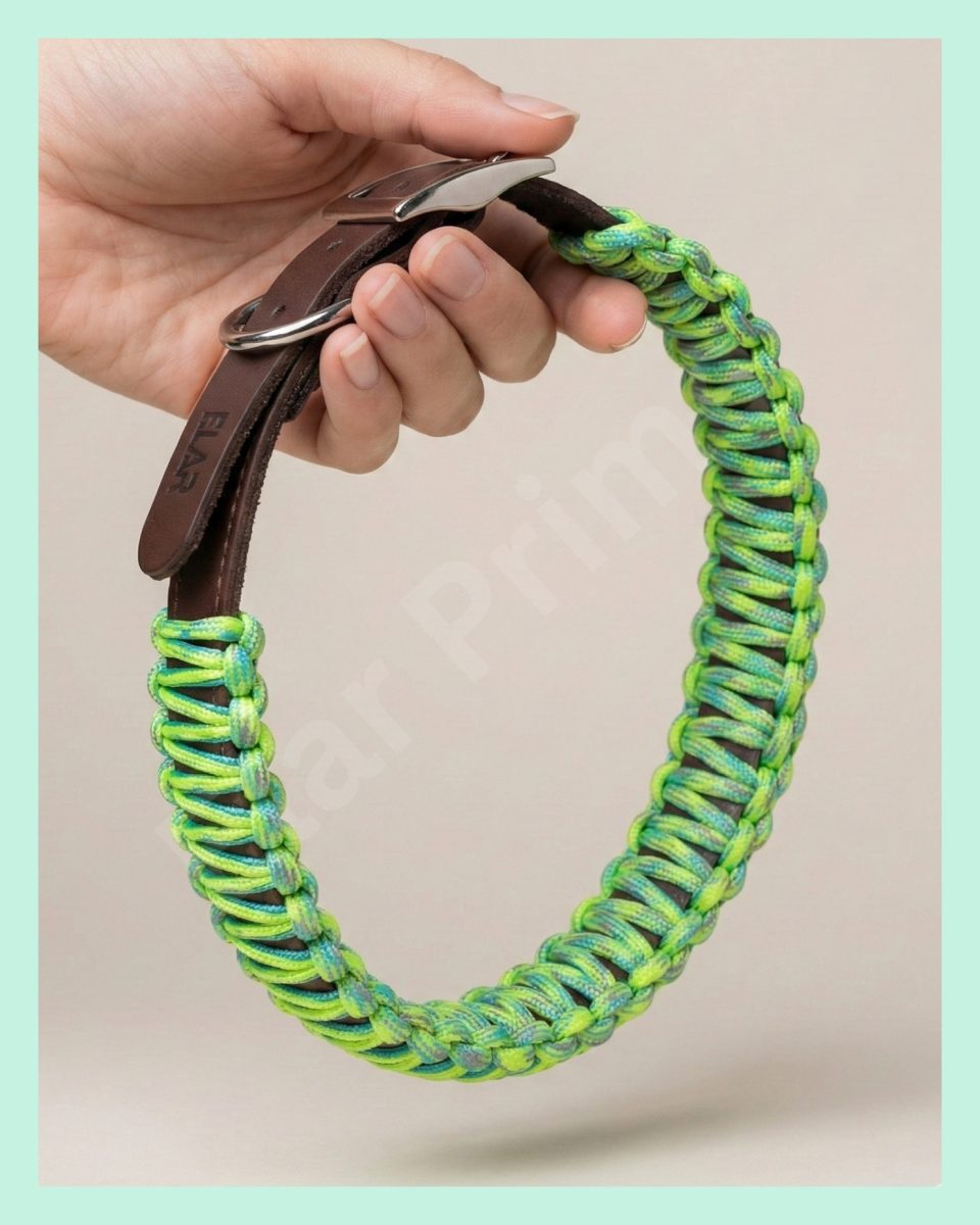 El yapımı örgü paracord ip ve gerçek deri kullanılarak hazırlanan bu köpek boyun tasması; yüksek dayanıklılık, konfor ve güvenliği tek bir tasarımda buluşturur. Gündüz yürüyüşlerinden akşam saatlerine kadar güvenle kullanılabilecek ideal bir aksesuardır.