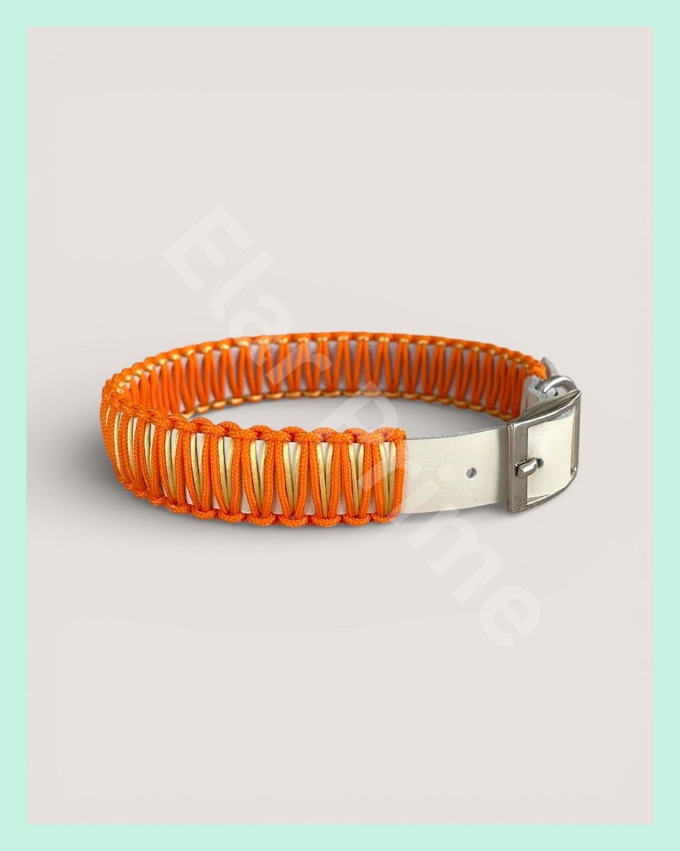 Örgü Urban 11 El Yapımı Paracord ve Deri Köpek Boyun Tasması, krem rengin sade ve zarif duruşunu turuncu tonların enerjisiyle birleştirerek dengeli ve şık bir görünüm sunar.