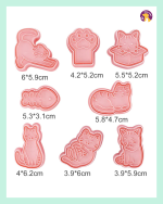 Sevimli kedi temalı 8 parça kurabiye kalıbı seti, paslanmaz çelik kesiciler ve 3D damgalarıyla fondan, bisküvi ve pasta süslemelerinde kolayca şekil ve desen oluşturur. Dayanıklı, hijyenik ve uzun ömürlü yapısıyla özel günler ve ev yapımı atıştırmalıklar için idealdir.