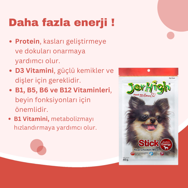 Jerhigh Tavuk Çubukları, gerçek tavuk etiyle üretilmiş, yüksek proteinli ve katkısız sağlıklı bir köpek ödül mamasıdır. 60 gr’lık pratik paketiyle eğitim ve oyun saatleri için idealdir.