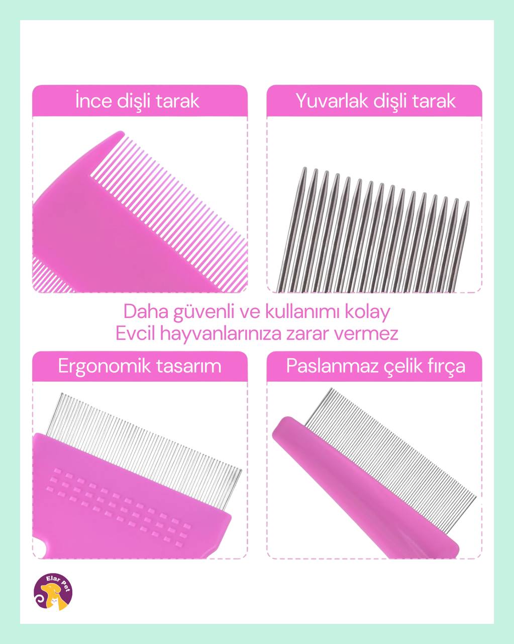 Ergonomik saplı tarak, tararken elinizin kaymasını önler. Küçük boyutlu taraklar ise yüz, kulak çevresi ve hassas bölgelerde güvenli temizlik sağlar. Düzenli kullanımda hem parazit oluşumunun önüne geçer hem de evcil hayvanınızın tüylerini sağlıklı ve parlak tutar.
