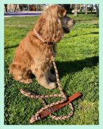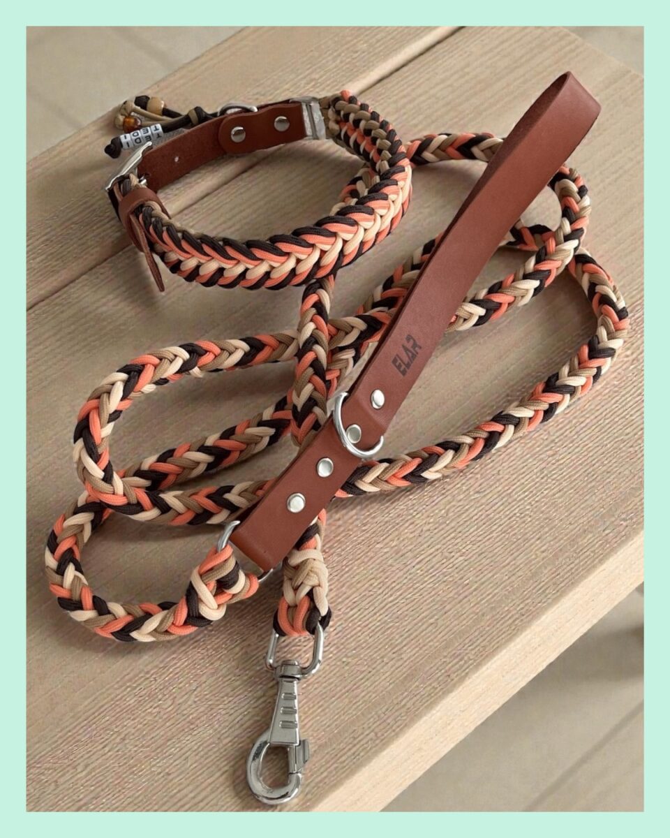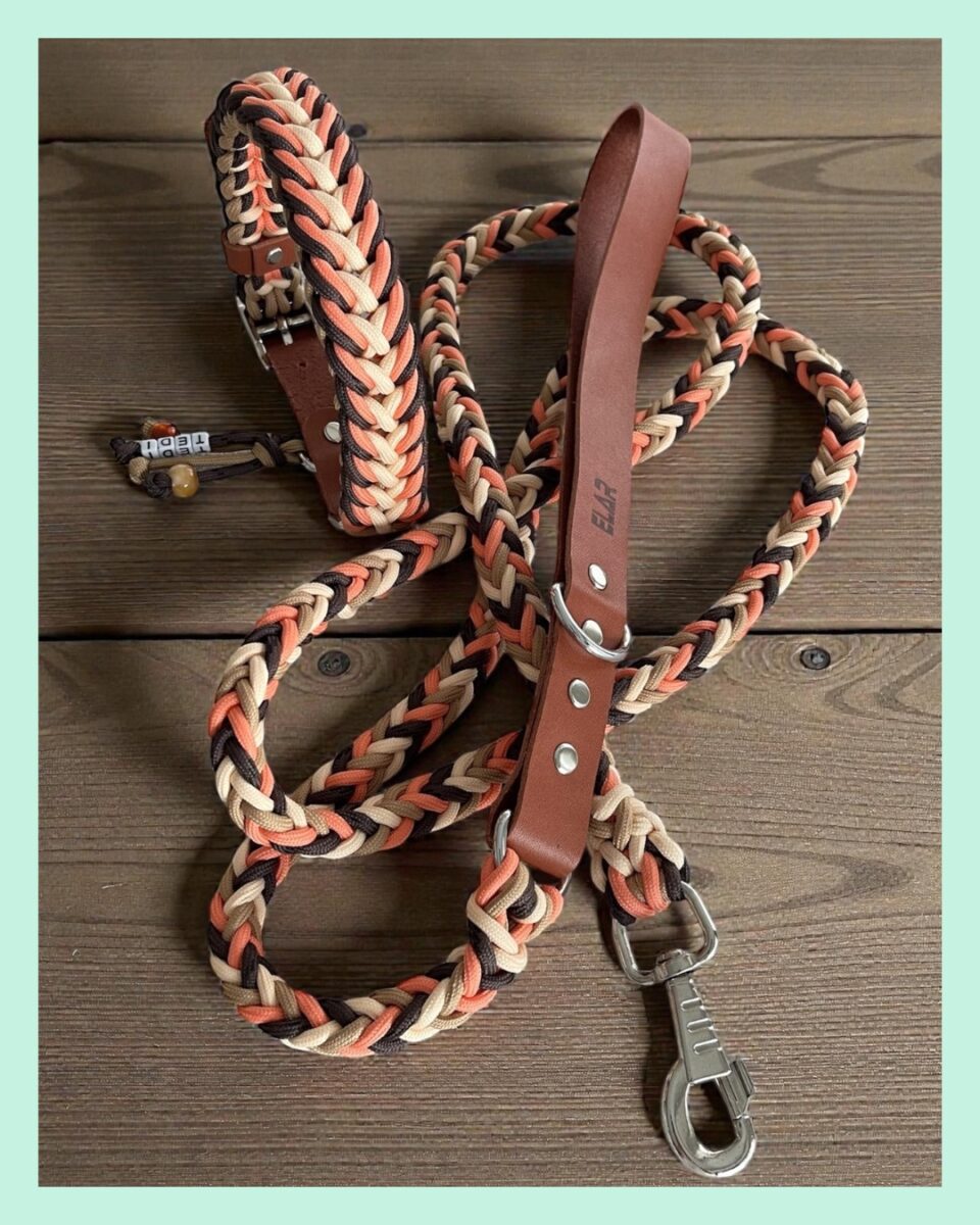 El Yapımı Paracord ve Deri Köpek Boyun Tasması ve Kayışı Seti – Örgü Strong 006 | Krem, Kahverengi & Somon