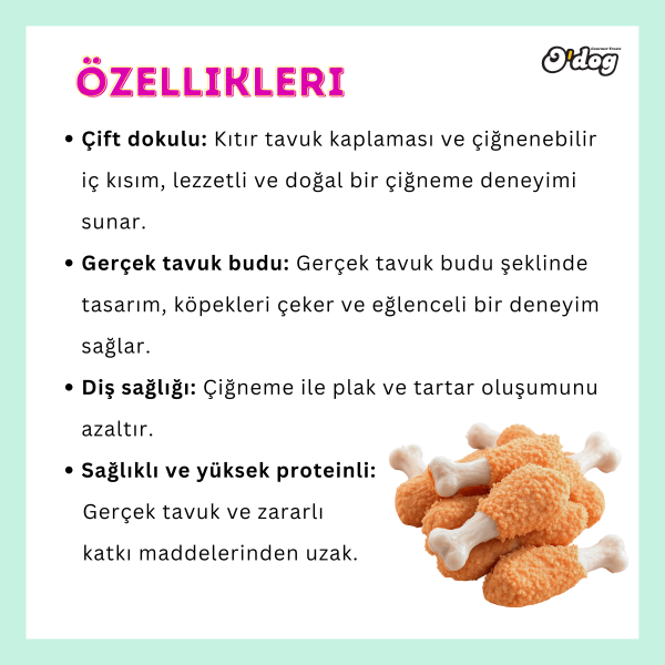 Köpekler için sert yapıdaki çiğneme ürünleri, diş temizliğine yardımcı olur. Kıtır Tavuk Budu Ödülü, sürekli çiğneme yoluyla plak ve tartar oluşumunu azaltmaya yardımcı olur, bu sayede köpeğinizin ağız sağlığı da korunmuş olur.