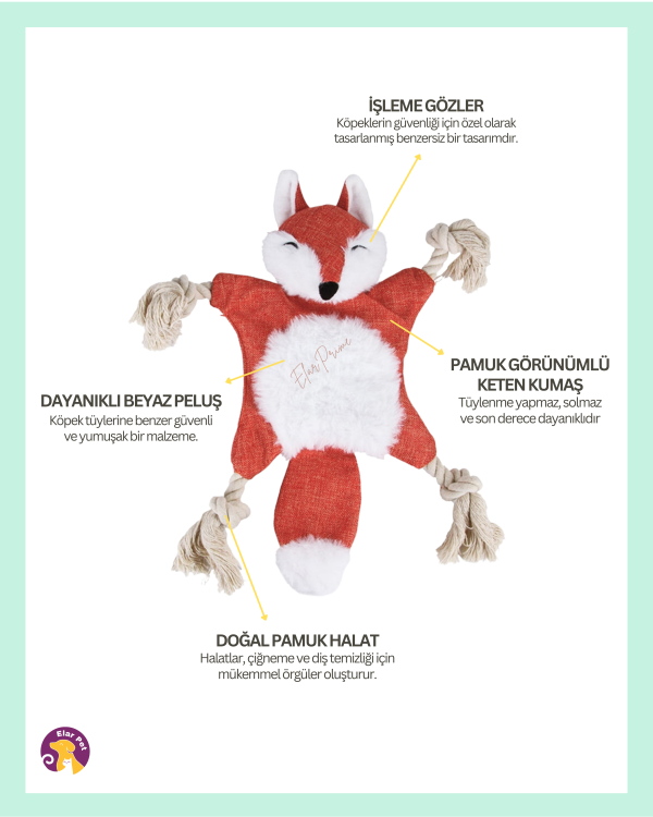 Sevimli tilki tasarımı, ses çıkaran mekanizması ve hışır kumaş detayları ile patili dostlarınızın ilgisini uzun süre çeker.