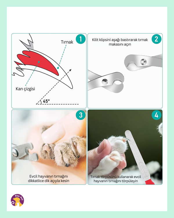 Tırnak makasını kullanırken ürün talimatlarına uyun ve fazla kesimden kaçının. Bu, evcil hayvanınızın yaralanmasını önler.